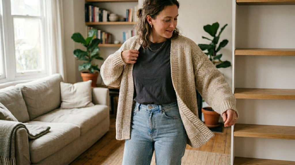 A neutral cardigan is a versatile layering item that can be worn both open and closed, based on the desired appearance and amount of comfort. It has a minimal design that has made it complement a range of clothes making it a good investment in providing a balanced and harmonized wardrobe.