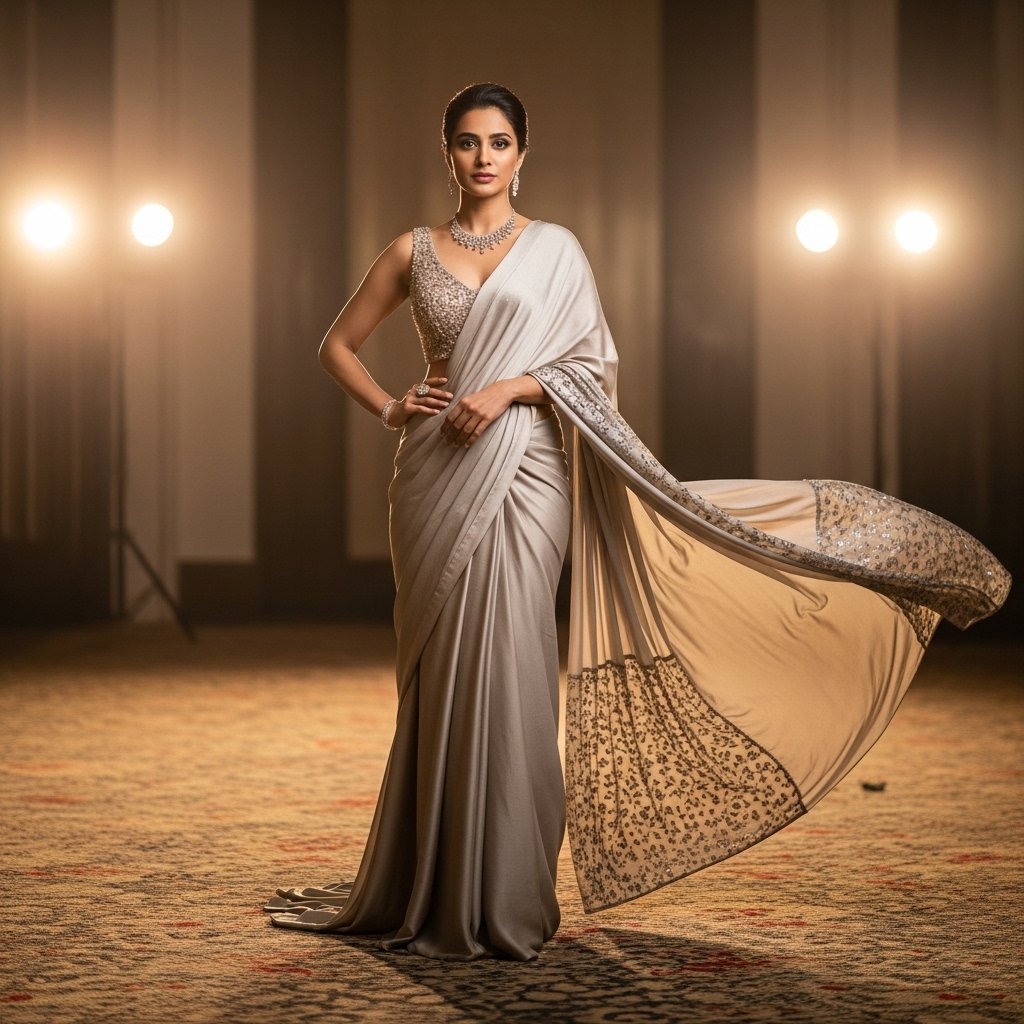 The fabric used was very important in enhancing the beauty of the appearance since the material was depthful and luminous and went well with the lighting and movements during the evening. Light textual details provided the richness without making the design too concerned that the refinement remained the main visual language in the ensemble.